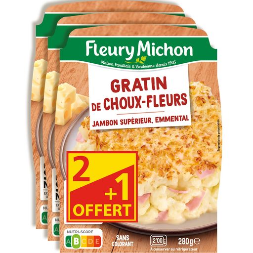 Ingrédients : Ingrédients:Choux-fleurs 46%, jambon cuit de qualité supérieure 14% [jambon de porc, eau, bouillon (eau, os et viande de porc, plantes aromatiques, ail, épices, jus concentré de carottes et de tomates, vin blanc, oignons, poireaux, CÉLERI, carottes, sucre), sel, arômes naturels (présence naturelle de polyphénols), chlorure de potassium, conservateur : vinaigre tamponné, dextrose, antioxydant : acide ascorbique, poivre], eau, CRÈME fraîche 9,9%, EMMENTAL 5,7%, crème de riz, poudre de LAIT écrémé, amidon de maïs, gélatine de porc, sel, farine de BLÉ, huile de colza, muscade, poivre.