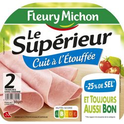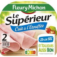 Un délicieux jambon finement tranché pour révéler toutes ses saveurs avec 25% de sel en moins*. Notre secret ? Nos cuisiniers charcutiers diminuent le sel et cuisinent des bouillons pour que ce soit toujours aussi bon ! *Par rapport à la moyenne de la catégorie. Jambon cuit à l'étouffée de qualité supérieure.