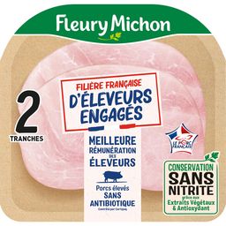 Le jambon Filière Française d'Éleveurs Engagés est garanti Conservation Sans Nitrite*, issu de porcs élevés en France sans antibiotique dès la naissance et nourris avec des aliments d'origine française. *grâce aux extraits végétaux et antioxydant