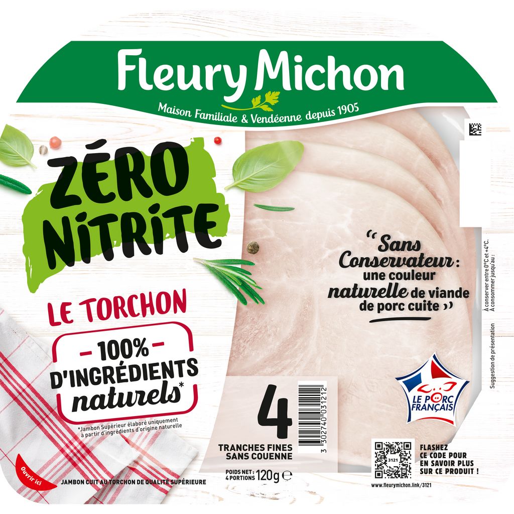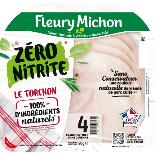 Jambon cuit au torchon de qualité supérieure Notre recette est élaborée sans aucune mise en oeuvre de nitrite afin de vous garantir un jambon sans conservateur. C'est pour cela qu'il a une couleur plus pale et qu'il se conserve moins longtemps.