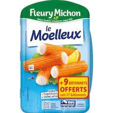 Ingrédients : Ingrédients:Chair de POISSON* 38%, eau, amidons (dont BLÉ), blanc d'OEUF réhydraté, huile de colza, sucre, LAIT écrémé réhydraté, sel, arômes naturels (contient CRUSTACÉS, MOLLUSQUES, POISSONS), colorant : extrait de paprika. * Colin d'Alaska et Merlu blanc pêchés en Pacifique Nord-Est / Nord-Ouest, Lieu noir pêché en Atlantique Nord-Est.