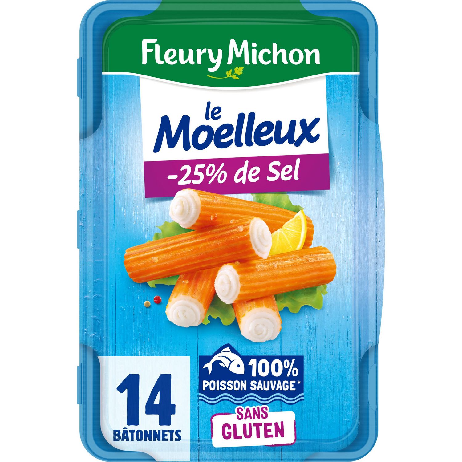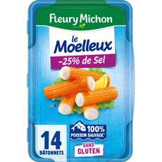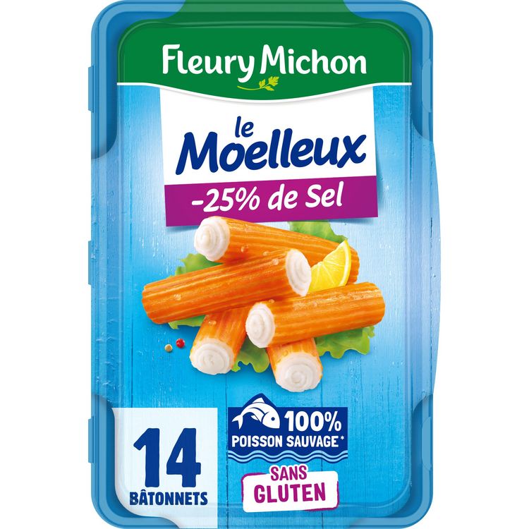 Fleury Michon réduit de 25 % la teneur en sel de ses bâtonnets Moelleux, tout en préservant son goût unique. Ces bâtonnets à la chair de poisson sauvage sont présentés dans une barquette refermable pour une fraîcheur maximale et une grande praticité.