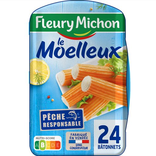 Préparation à base de chair de poisson Pour élaborer nos bâtonnets Moelleux, nous nous en tenons à la recette d'origine : de la chair de poisson, de l'amidon de blé et de la fécule de pomme de terre, de l'huile de colza, de l'arôme naturel aux extraits de crabe et un peu de sel et de sucre pour le goût. Et c'est tout ! Sa couleur orange ? De l'extrait de paprika tout simplement. Pour un maximum de fraîcheur et de praticité, nos 24 bâtonnets sont présentés dans une barquette refermable.