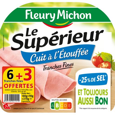 Jambon cuit à l'étouffée de qualité supérieure Un délicieux jambon finement tranché pour révéler toutes ses saveurs avec 25% de sel en moins*. Notre secret ? Nos cuisiniers charcutiers diminuent le sel et cuisinent des bouillons pour que ce soit toujours aussi bon ! *Par rapport à la moyenne de la catégorie.