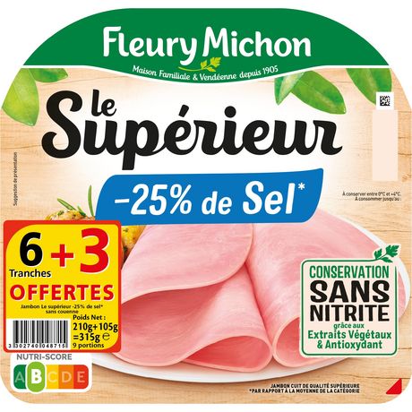 Le Supérieur, le jambon de qualité Fleury Michon cuisiné avec tout le savoir-faire de nos charcutiers, garanti Conservation Sans Nitrite* avec 25% de sel en moins**. *grâce aux extraits végétaux et antioxydant ** par rapport à la moyenne de la catégorie