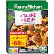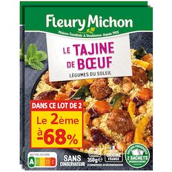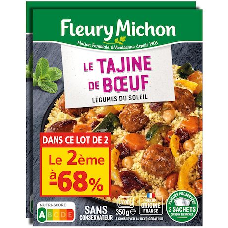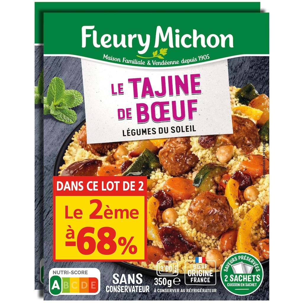 Un plat mijoté traditionnel, inspiré de la cuisine orientale : des boulettes de boeuf français cuisinées avec des oignons et des épices, accompagnées d'une compotée de légumes typiques des tajines (courgettes, aubergines, poivrons, pois chiches...), le tout agrémenté d'une pointe de menthe. Et pour accompagner ce tajine, une semoule fine et moelleuse avec des raisins secs