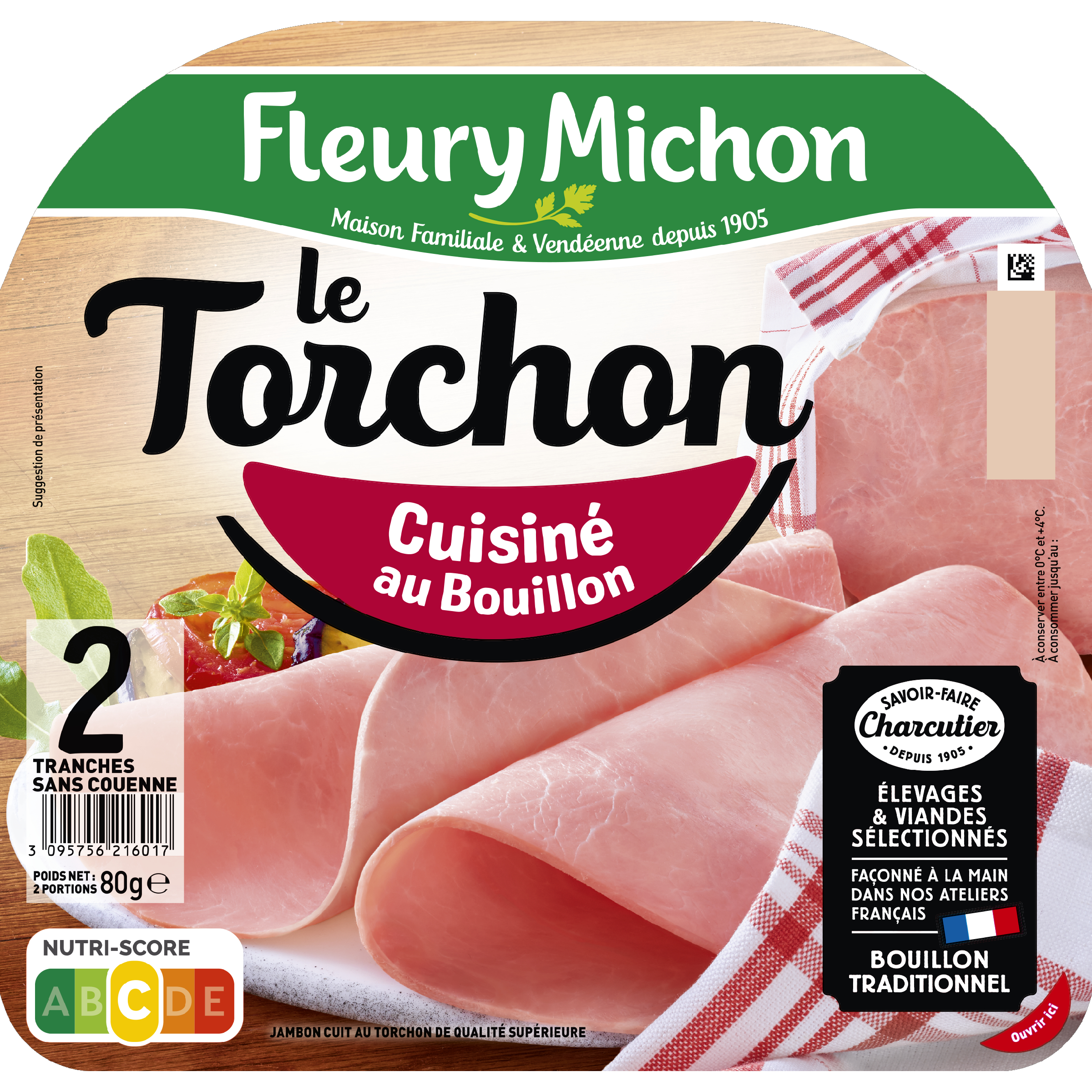 Jambon cuit au torchon de qualité supérieure Un goût unique ! Cuisiné dans un bouillon de légumes, puis cuit lentement à l'étouffée avec son torchon, ce jambon révèle en bouche un goût à la fois subtil et de caractère.