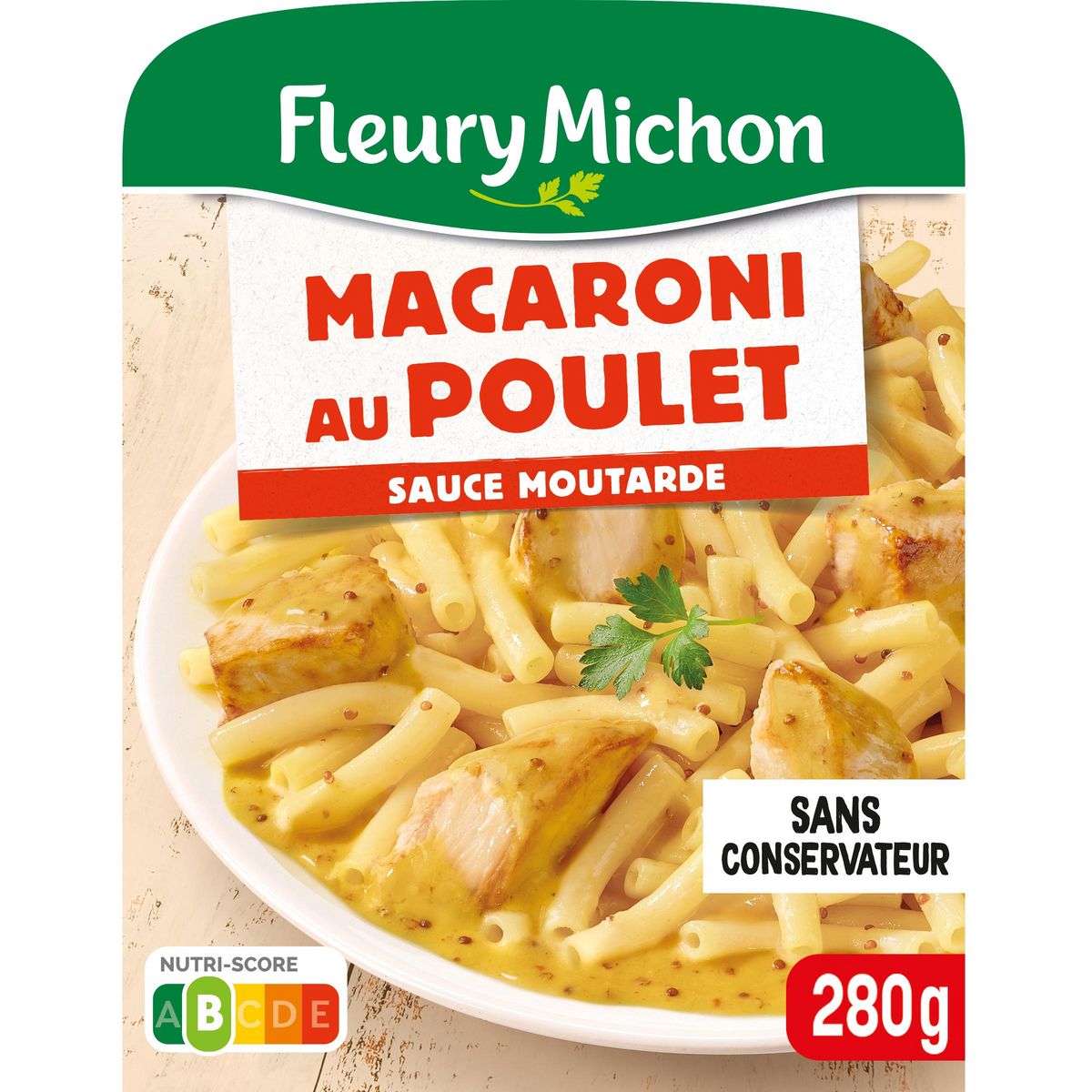 Ingrédients : Ingrédients:Pâtes macaroni 50% (eau, semoule de BLÉ dur, curcuma), eau, poulet traité en salaison 14% (poulet 13,7%, amidon de tapioca, dextrose, sel), CRÈME fraîche 6,4%, MOUTARDE de Dijon 3,3% (eau, graines de MOUTARDE, vinaigre d'alcool, sel), MOUTARDE à l'ancienne 2,8% (eau, graines de MOUTARDE, vinaigre d'alcool, sel), vin blanc, fond de volaille (eau, os de poulet, sel), huile de colza, amidon de riz, BEURRE, sel, poivre, curcuma.Traces éventuelles de céleri, soja