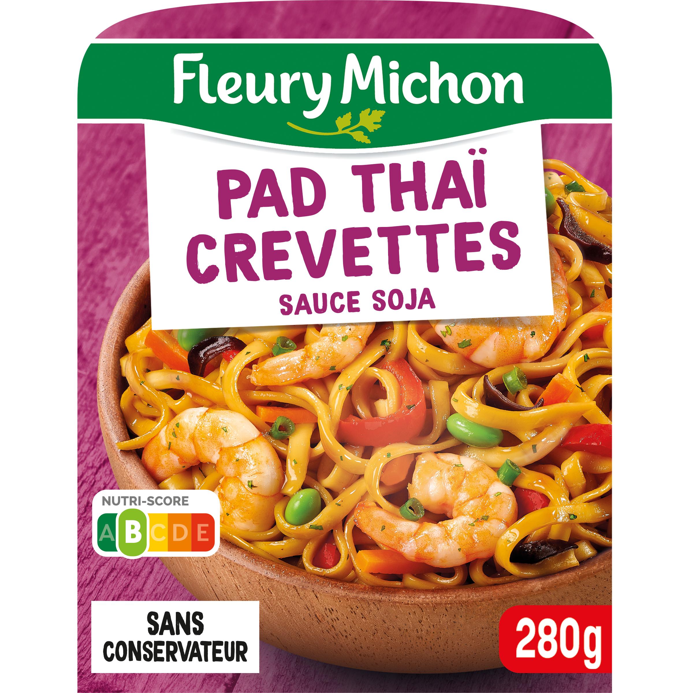 Ingrédients : Ingrédients: Pâtes linguine 38% (eau, semoule de BLÉ dur, curcuma), crevettes 15% (CREVETTES 14%, eau, sel), eau, carottes 7,1%, poivrons rouges 6,6%, fèves de SOJA 5%, huile de colza, champignons noirs 2,8%, échalotes, sauce de poisson (extrait d'ANCHOIS, sel, sucre), sucre, citron vert, sauce soja 1,4% (eau, graines de SOJA, BLÉ, sel), ciboule, gingembre, amidon de riz, ail, coriandre, basilic, extrait de malt d'ORGE, piment, paprika._Traces éventuelles de lait