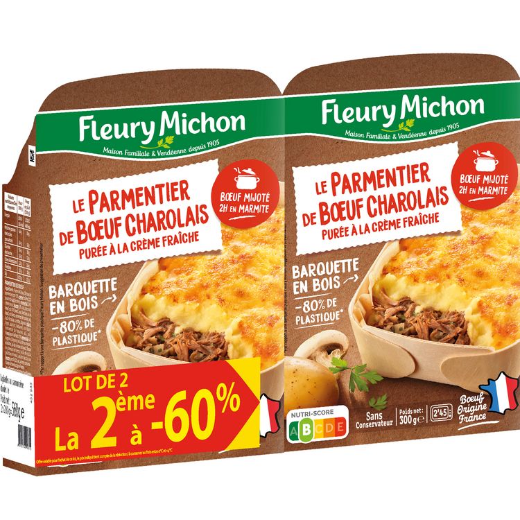 Ingrédients : Ingrédients: Purée 64% [eau, flocons de pommes de terre 7.6%, CREME fraîche 3.2%, poudre de LAIT écrémé, EMMENTAL 2.6%, crème de riz, BEURRE 0.8%, sel, curcuma], boeuf cuit 12% [boeuf, eau, fond (eau, os de boeuf, vin blanc, concentré de tomates, sel, huile de colza, carottes, oignons, CELERI, thym, laurier, badiane), vin blanc, concentré de tomates, ail, sel], champignons de Paris 7.3%, EMMENTAL 4.6%, oignons (oignons, huile de tournesol), échalotes, jus de cuisson du boeuf, flocons de pommes de terre, huile de colza, gélatine de boeuf, amidon de riz, eau, BEURRE, persil 0.2%, sel, poivre, curcuma.