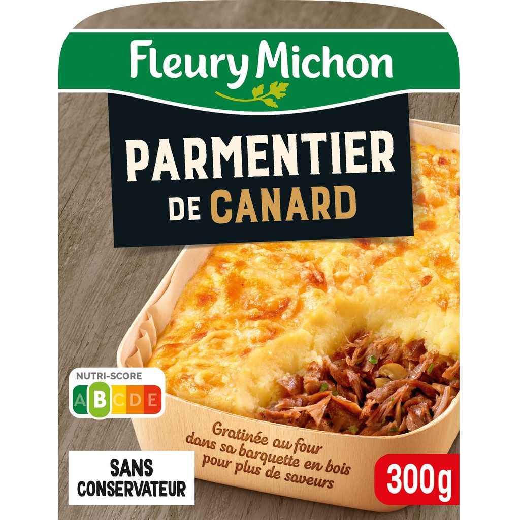 Ingrédients : Ingrédients:Purée 66% (eau, flocons de pommes de terre 9,1%, CRÈME fraîche 6,8%, poudre de LAIT écrémé, crème de riz, BEURRE 1,3%, sel, curcuma), viande de canard 12%, oignons, EMMENTAL 5%, champignons de Paris 4,3%, matière protéique de pois 2,5%, madère (madère, sel), graisse de canard, eau, flocons de pommes de terre 0,4%, épices, plantes aromatiques, ail, farine de manioc, sel. Traces éventuelles de arachides, fruits à coque, sésame