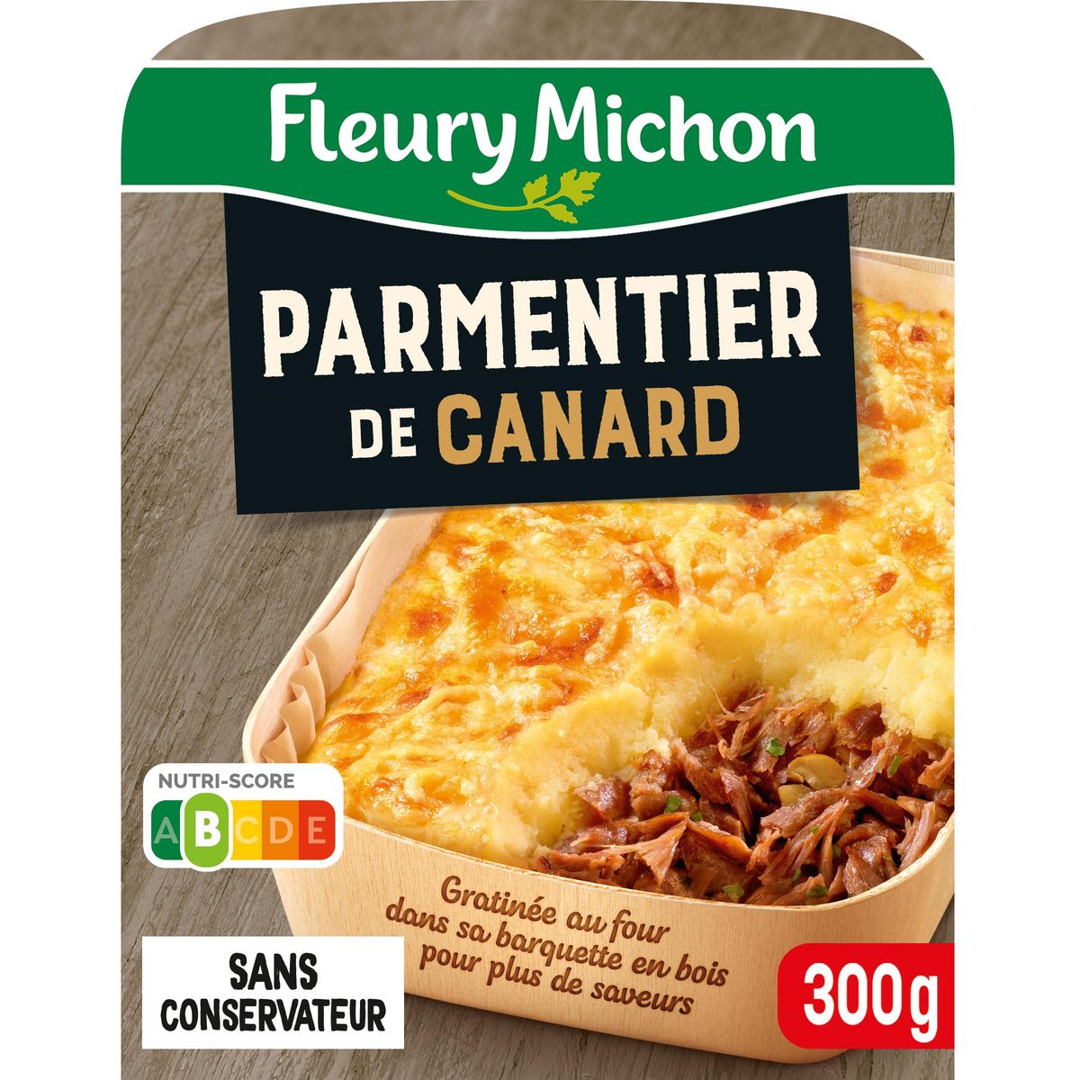 Du canard confit fondant cuisiné au Madère et champignons, associé à une purée de pommes de terre à la crème, gratinée à l'emmental dans une barquette en bois !