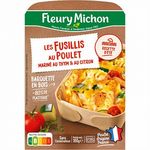 Pâtes fusillis poulet traité en salaison mariné tomates courgettes ricotta et citron