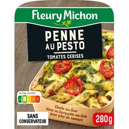 Nos penne pesto : un véritable pesto avec du basilic, du parmesan AOP, des pignons de pins et un filet d'huile d'olive, présentée dans une barquette en bois !