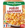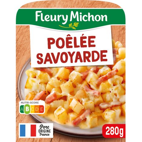 Ingrédients : Ingrédients:Pommes de terre 58%, lardons cuits fumés 10,7% [poitrine de porc, sel, arômes naturels (contient naturellement des polyphénols), antioxydant : acide ascorbique. Fumage au bois de hêtre], eau, huile de tournesol, CRÈME fraîche 3,3%, REBLOCHON 2,9% (LAIT cru de vache, sel, ferments LACTIQUES, présure, colorant : norbixine de rocou), oignons frits 2,7% (oignons, huile de tournesol), EMMENTAL, huile de colza, jaune d'OEUFS, poudre de LAIT écrémé, crème de riz, amidon de riz, dextrose, sel, épices.