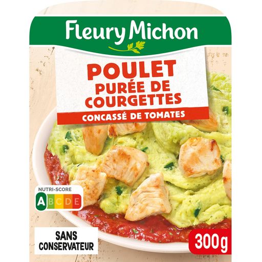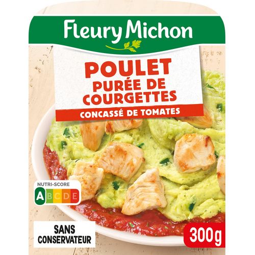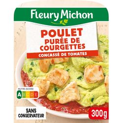 Des morceaux de poulet accompagnés d'un concassé de tomates cuisiné à l'ail et au thym et d'une délicieuse purée de courgettes.