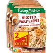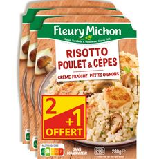 Cette recette est composée d'un riz sélectionné par nos chefs pour retrouver tout le caractère d'un risotto. Il est accompagné de blanc de poulet émincé, de champignons de Paris, de cèpes, et d'une sauce à la crème fraîche relevée de vin blanc. Le tout est cuit le temps qu'il faut pour obtenir toute l'onctuosité d'un risotto.