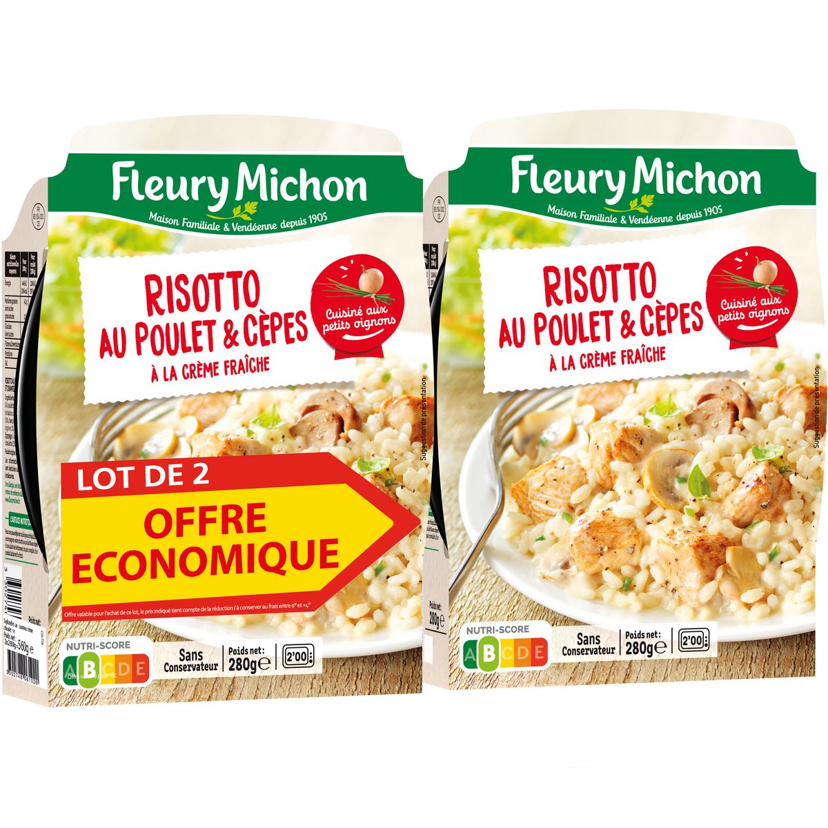Ingrédients : Ingrédients: Eau, riz cuit 23%, poulet traité en salaison (poulet 13%, amidon de tapioca, dextrose, sel), CREME fraîche 12%, crème de riz, cèpes 3.4%, champignons de Paris 2.9%, vin blanc 2.1%, oignons 2%, amidon de riz, FROMAGE à pâte dure, huile de colza, farine de BLE, sel, ciboulette 0.2%, poudre de cèpes, poivre.