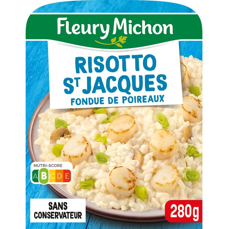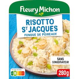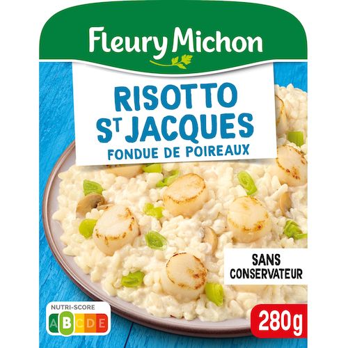 Ingrédients : Ingrédients:Riz 29% (eau, riz), poireaux 13%, champignons de Paris 11%, noix de SAINT-JACQUES* 11,7% (Zygochlamys Patagonica Argentine ou Chlamys Opercularis Islande / Iles Féroé ou Argopecten Purpuratus Pérou), eau, CRÈME fraîche 7,3%, échalotes 4,6%, amidon de riz, vermouth Noilly prat® 1,7% (contient LAIT), vin blanc 1,7%, FROMAGE à pâte dure 1,7%, crème de riz, poudre de LAIT écrémé, huile de colza, farine de BLÉ, vinaigre de vin blanc, sel, gélatine de POISSON, jus concentré de MOULES, persil, jus concentré de champignons, poivre, piment. * Voir à l'emplacement de la date limite de consommation. Traces éventuelles de crustacés