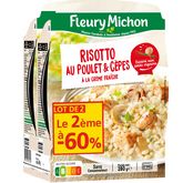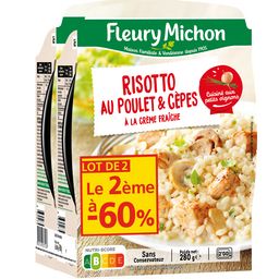 Ingrédients : Ingrédients: Eau, riz cuit 23%, poulet traité en salaison (poulet 13%, amidon de tapioca, dextrose, sel), CREME fraîche 12%, crème de riz, cèpes 3.4%, champignons de Paris 2.9%, vin blanc 2.1%, oignons 2%, amidon de riz, FROMAGE à pâte dure, huile de colza, farine de BLE, sel, ciboulette 0.2%, poudre de cèpes, poivre.