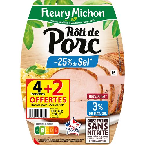 Chez Fleury Michon, notre rôti est cuisiné avec 25% de sel en moins* et cuit lentement à l'étouffée avec des bouillons pour révéler toutes ses saveurs. *Par rapport à la moyenne de la catégorie.