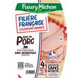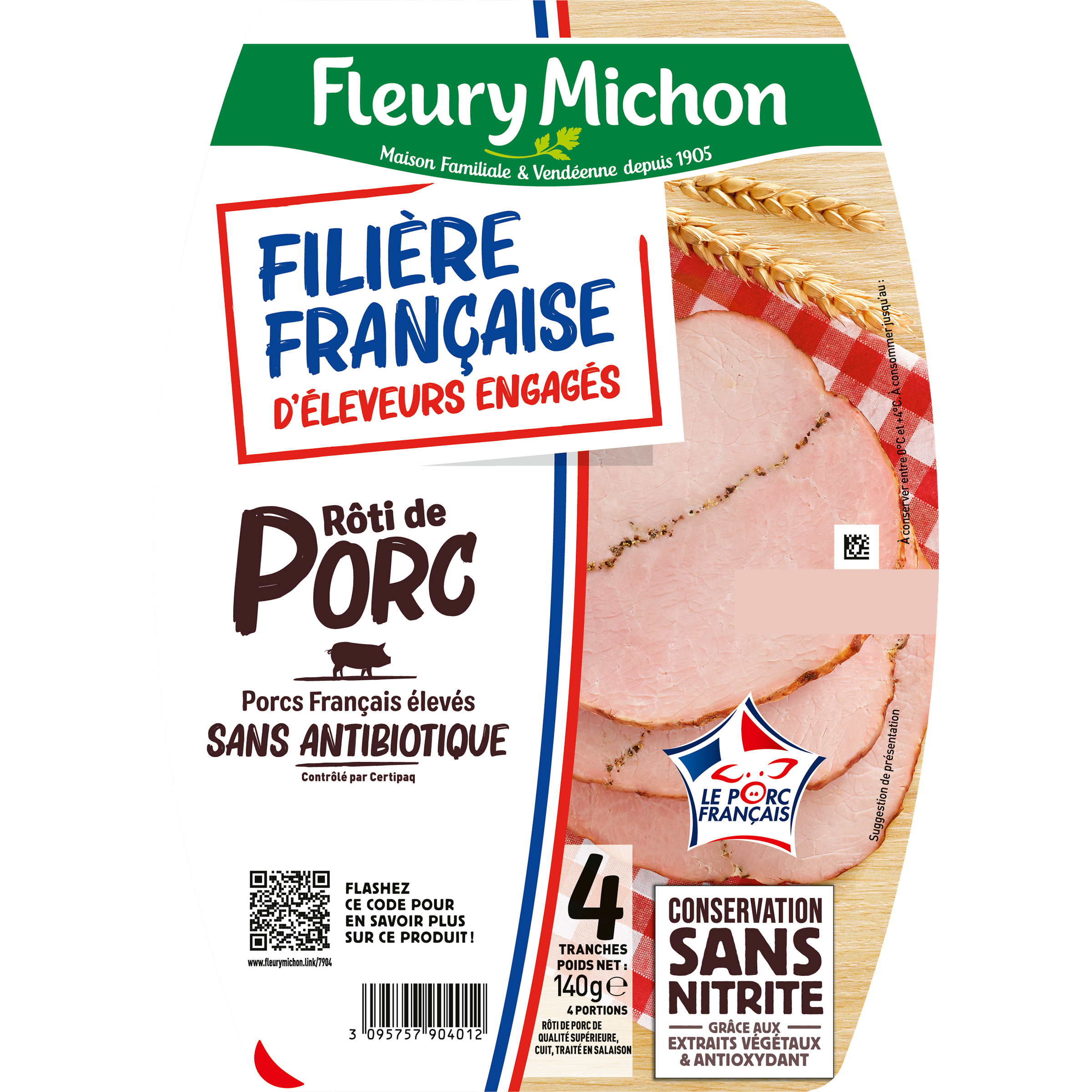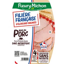Avec la Filière Française d'Éleveurs Engagés, Fleury Michon propose un rôti garanti Conservation Sans Nitrite* issu de porcs élevés en France sans antibiotique dès la naissance et nourris avec des aliments d'origine française. Un goût toujours aussi savoureux tout en offrant une meilleure rémunération aux producteurs français. *grâce aux extraits végétaux et antioxydant