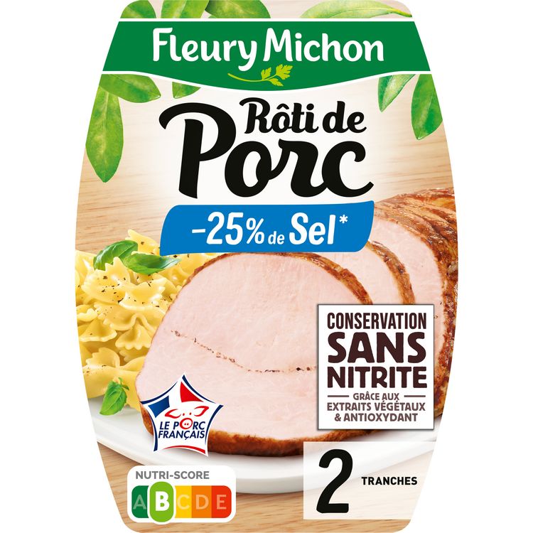 Notre rôti de porc est garanti Conservation Sans Nitrite* et origine France, avec 25% de sel en moins**. Il est cuit lentement à l'étouffée avec des bouillons pour révéler toutes ses saveurs. *grâce aux extraits végétaux et antioxydants **Par rapport à la moyenne de la catégorie.