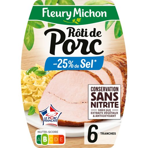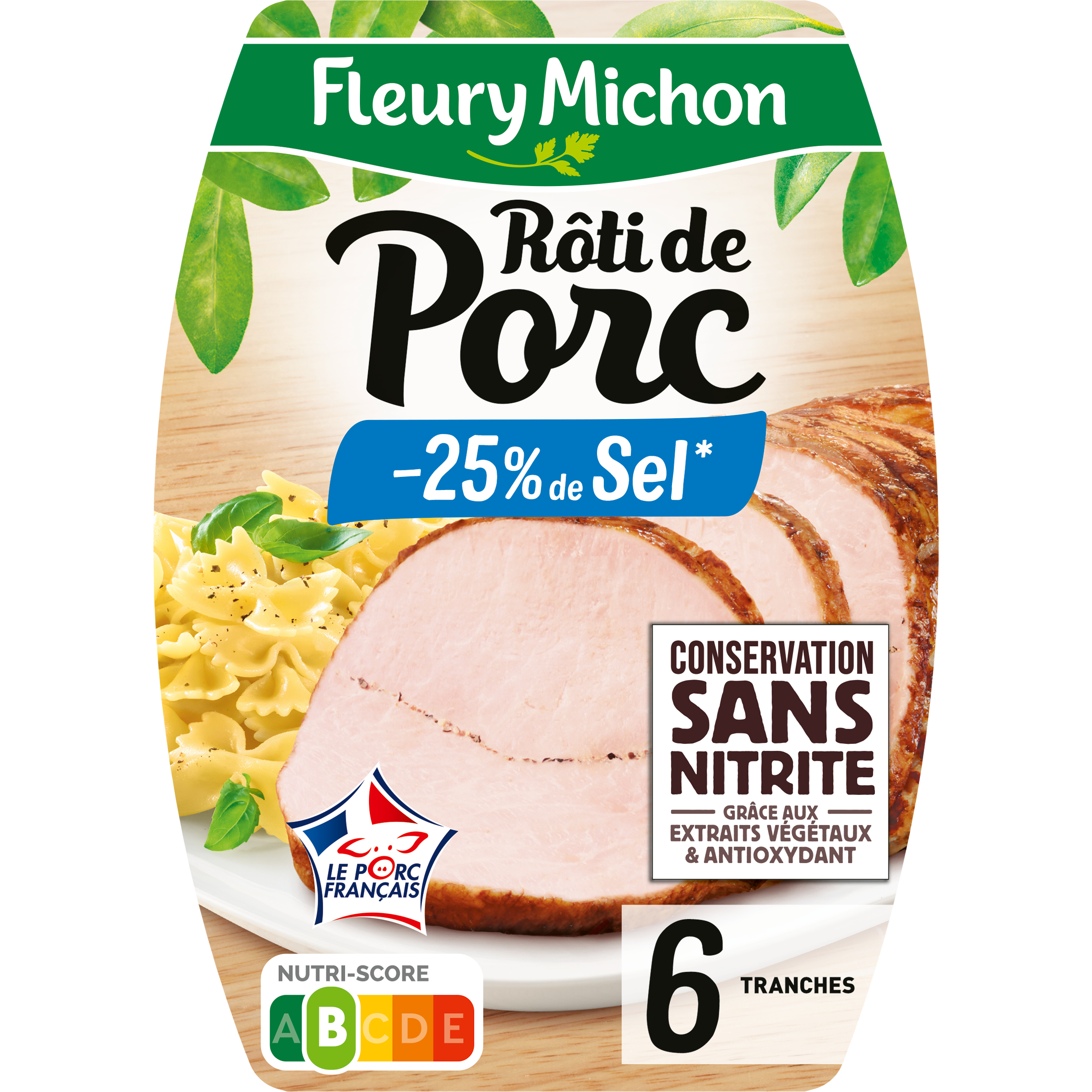 Notre rôti de porc est garanti Conservation Sans Nitrite* et origine France, avec 25% de sel en moins**. Il est cuit lentement à l'étouffée avec des bouillons pour révéler toutes ses saveurs. *grâce aux extraits végétaux et antioxydants **Par rapport à la moyenne de la catégorie.