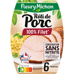 Découvrez notre rôti de porc 100% filet garanti Conservation Sans Nitrite* : du porc origine France, préparé avec sa ligne de poivre et son bouillon puis cuit lentement à l'étouffée pour plus de tendreté et de saveurs. *grâce aux extraits végétaux et antioxydants
