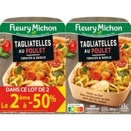 Ingrédients : Ingrédients: Pâtes tagliatelles 37% (eau, semoule de BLÉ dur, curcuma), tomates cerises 13%, émincés de viande de cuisse de poulet traité en salaison rôti 13% (viande de cuisse de poulet 11%, eau, amidon de tapioca, dextrose, sel), concassé de tomates 9,4% (tomates, jus de tomates, jus de citron concentré), eau, CRÈME fraîche, crème de riz, mozzarella 2,3% (LAIT pasteurisé, ferments LACTIQUES, sel, anti-agglomérant : amidon de pommes de terre), basilic 2,1%, huile de colza, épinards, oignons, PARMESAN 0,7%, amidon de riz, FROMAGE à pâte dure, ciboulette, huile d'olive vierge 0,4%, sel, échalotes, concentré de tomates, ail, pignons de pin 0,07%, curcuma, poivre, thym._Traces éventuelles de arachides, fruits à coque, sésame