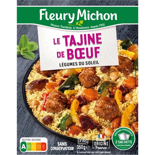 Ingrédients : Ingrédients:Semoule de BLÉ cuite 24%, boulettes de boeuf 13,7% (viande de boeuf 10%, blanc d'OEUFS, chapelure (dont BLÉ), fibre de pois, fécule de pommes de terre, oignons, poivrons rouges, épices, sel, huile de tournesol), carottes 11%, courgettes 11%, eau, aubergines préfrites 6,2% (aubergines, huile de tournesol), oignons, poivrons jaunes 4,7%, poivrons rouges 4,7%, pois chiches 2,8%, raisins secs 1,9%, huile de colza, concentré de tomates, farine de tapioca, sel, épices 0.6%, menthe 0.2%, ail. Traces éventuelles de céleri, lait, moutarde, soja