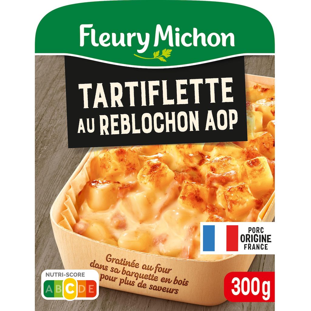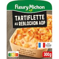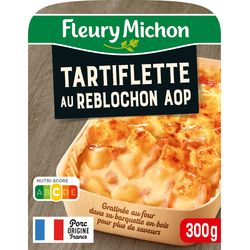 Ingrédients : Ingrédients:Pommes de terre 57% (pommes de terre, sel), CRÈME fraîche 9,3%, REBLOCHON de Savoie AOP 8,4% (LAIT cru de vache, sel, ferments LACTIQUES, présure, colorant : norbixine de rocou), lardons fumés cuits 6,9% [poitrine de porc, sel, arômes naturels (contient naturellement des polyphénols), antioxydant : acide ascorbique. Fumage au bois de hêtre], eau, oignons 4,7%, crème de riz, vin blanc, oignons frits (oignons, huile de tournesol), farine de BLÉ, amidon de riz, huile de colza, gélatine de porc, sel fumé, BEURRE, épices.