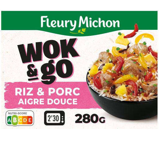 Ingrédients : Ingrédients: Riz 34% (eau, riz), poivrons 18% (rouges et jaunes), viande de porc 8,7%, huile de colza, pousse de bambou 4,5%, maïs cuit 4,1% (eau, maïs, curcuma), champignons noirs 3,2%, oignons, ananas 2,8%, sucre, concentré de tomates, concassé de tomates 2,2% (tomates, jus de tomates, jus de citron concentré), eau, vinaigre de vin blanc, huile de SESAME grillé, sauce soja 0,9% (eau, graines de SOJA, BLE, sel), gingembre, graines de SESAME 0,7%, farine de manioc, sel, ail, coriandre, fécule de manioc, épices._Traces éventuelles de arachides, fruits à coque, céleri, moutarde, lait