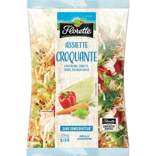 Chou blanc, Carotte, Frisée, Poivron rouge Un mélange de 4 variétés spécialement sélectionnées pour leur croquant qui allie la légère amertume de la frisée, la saveur sucrée de la carotte, la texture très croquante du chou blanc et la couleur intense du poivron rouge.