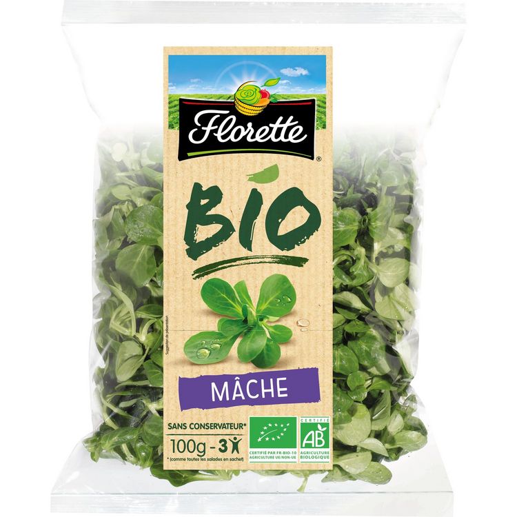 Mâche BIO 100G La Mâche BIO Florette respecte les méthodes de culture de l’Agriculture Biologique. Avec sa fine saveur de noisette, cette salade tendre et authentique séduira petits et grands.