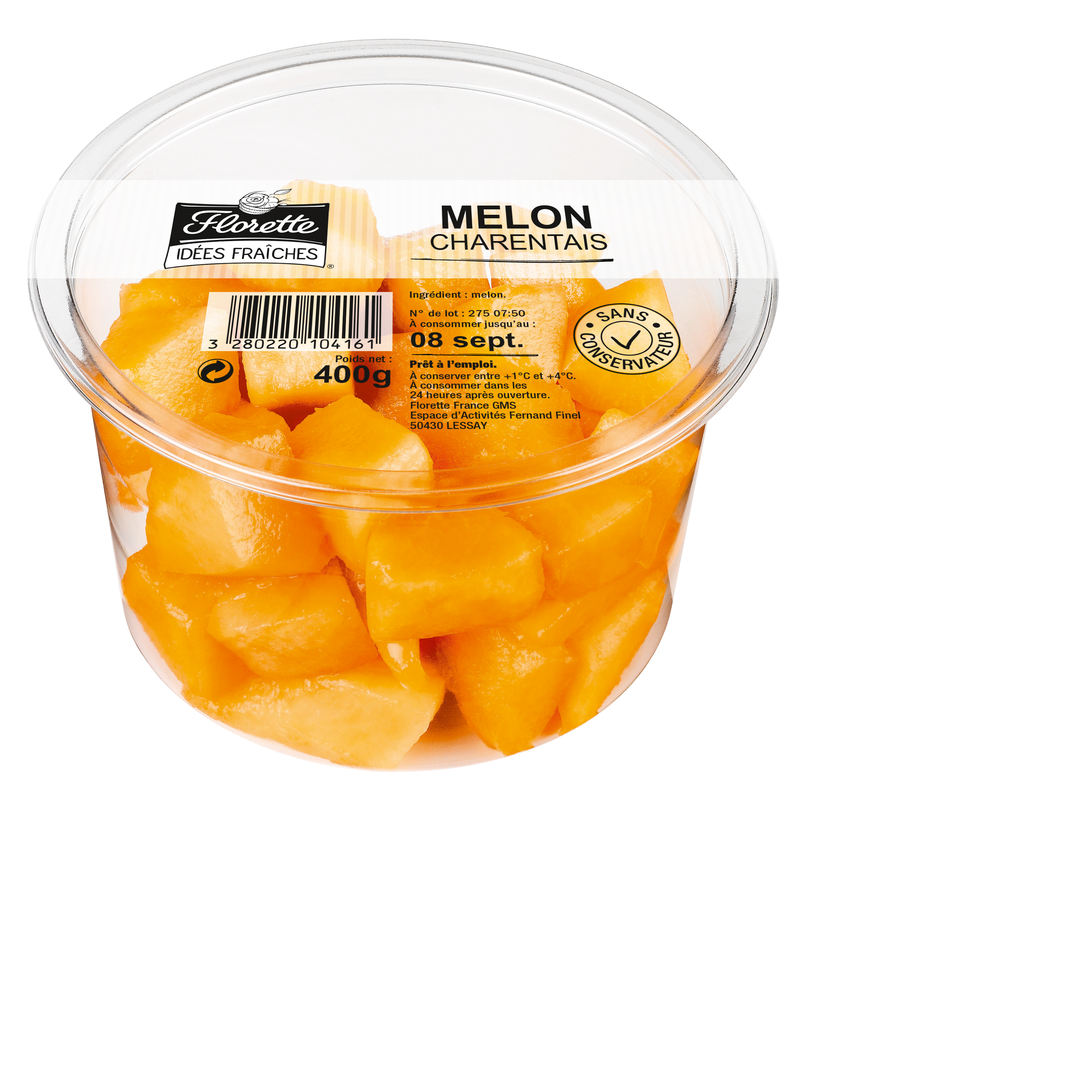 Mélange de fruits Melon charentais fraîchement découpé en cubes. Variété orange et juteuse réputée pour sa saveur parfumée.