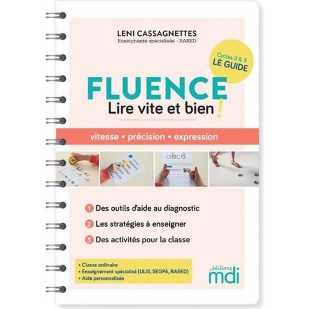 Un guide pédagogique tous niveaux (du CP au CM2, alte ordinaire ou enseignement spécialisé) qui comprend : - Un état des lieux des connaissances et des pratiques actuelles : définition du concept, rôle dans l'apprentissage de la lecture, attendus des programmes, etc. - Les outils pour bien évaluer le niveau de fluence : les différents tests (ELFE, EMDF, etc.), le but recherché, l'analyse des résultats. - Des propositions pour travailler la fluence au quotidien : 35 stratégies à enseigner autour des 4 composantes de la fluence (vitesse, précision, expression, fluence en contexte) pour acquérir les bons automatismes. 92 activités ludiques tous niveaux . adaptables à toutes les configurations (en alte entière, en binômes ou en ateliers) pour comprendre et automatiser la mise en place de chaque stratégie. + Tous les supports d'activités (à imprimer ou personnaliser) disponibles sur le site compagnon de la collection Fluence : fluence. mdi-editions. com : - Les tableaux et schémas de référence - Les fiches de suivi des élèves (exemples et trames vierges) - Les cartes d'ancrage pour chaque stratégie - Les mémos (tableaux ou marque-pages)Les différents supports pour les fiches d'activités (listes, cartes, caches, etc.) Les + : Un format pratique pour l'enseignant avec : - une reliure en spirales qui permet de maintenir le guide ouvert pendant l'activité , - de nombreux tableaux, schémas explicatifs et QR codes renvoyant vers des vidéos, articles ou propositions de textes , - des fiches d'activités synthétiques et visuelles pour une mise en oeuvre simple et efficace ! Découvrez la collection Fluence : https : //fr. calameo. com/read/005358335495a5912391e Rejoignez le groupe Facebook Fluence : lire vite et bien ! : https : //www. facebook. com/groups/1093981891129789 L'autrice : Leni Cassagnettes est professeure des écoles spécialisée dans la difficulté scolaire. Maitresse E (RASED) depuis plus de dix ans, elle a aussi promené son cartable en ULIS et IME. Elle est l'auteure du blog Maitresseuh.