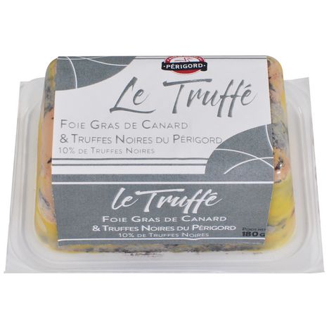 Foie gras de canard, du Périgord, brisures de truffes noires du Périgord (Tuber Melanosporum) 10%, Porto, sel, poivre, sucre, conservateur : nitrite de sodium, antioxydant : acide ascorbique.