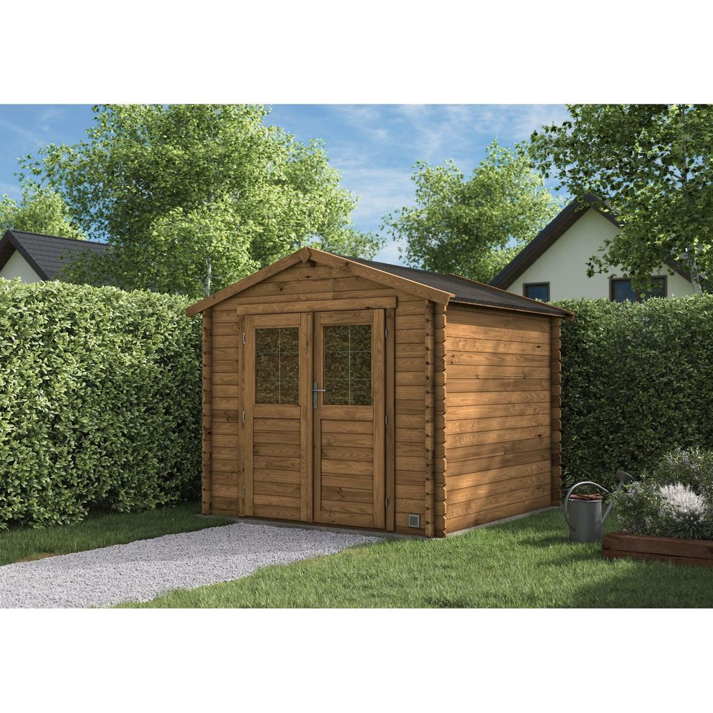 Abri NICIA 4,9m² Traité classe 3 marron en Pin Sylvestre. Madriers : Epaisseur 28 mm - Finition des madriers arrondie. 2 portes en 75 x 175cm = Confort d’utilisation. Vitrage en verre 4mm avec joint silicone + croissillons en métal intérieur. Serrure à barillet = Sécurisation de l’abri. 2 grilles de ventilation (10 x 10cm) = Aération + éviter la condensation. Quincaillerie en acier galvanisé. Toiture en volige (18mm) + feutre bitumeux. Lames anti-tempête fournies. Dimensions intérieures : 222 x 222cm - Dimensions extérieures : 245 x 245cm - Dimensions hors-tout : 269 x 256 x H 230cm. Surface intérieure : 4,9m² - Surface extérieure : 6,0m².