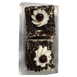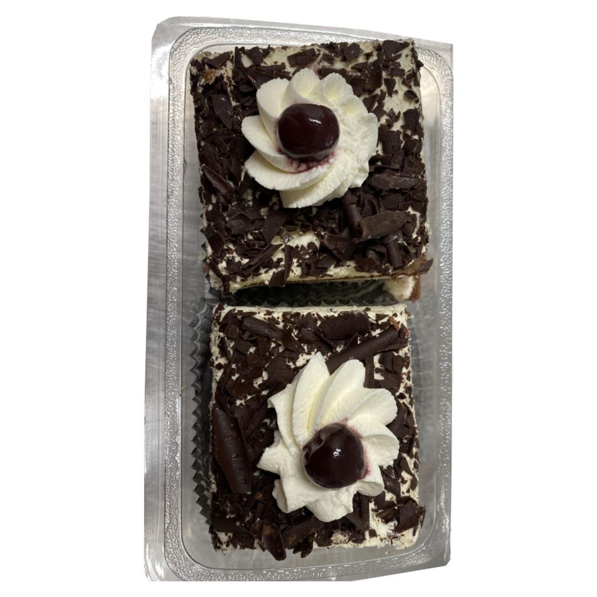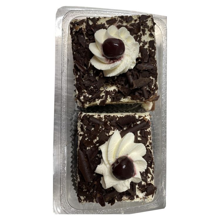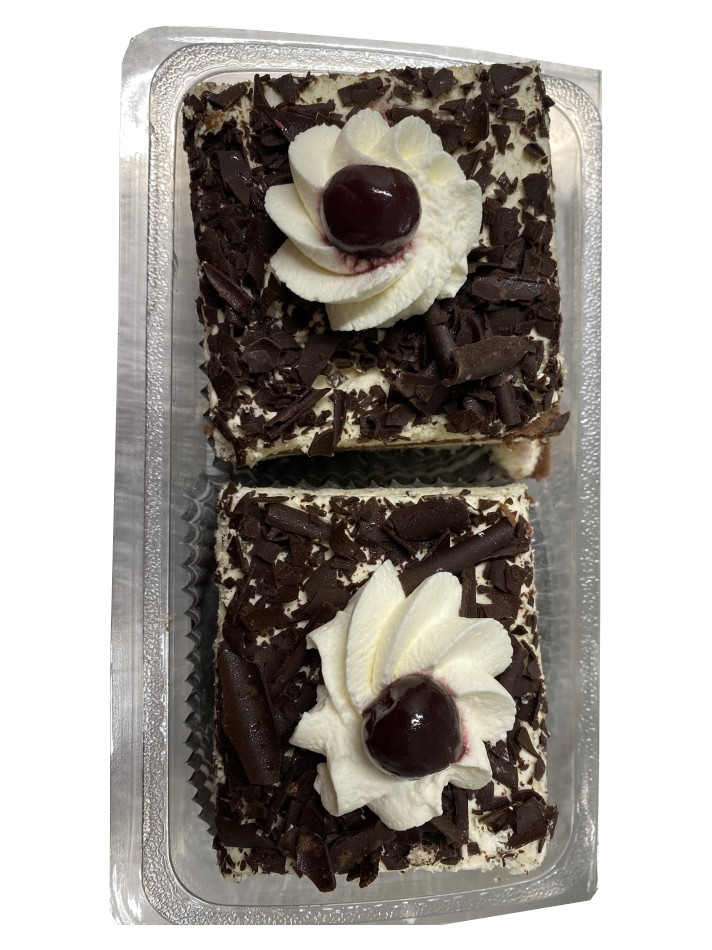 Génoise cacao : ufs, sucre, farine de blé (gluten), amidon de blé, eau, stabilisant: sorbitol cacao maigre en poudre 2%, émulsifiants: E472b, E477, poudre à lever: E450, E500, sirop de glucode, poudre de lait écrémé, sel conservateur : sorbate de potassium, épaississant : gomme de caroube, arôme, colorants, riboflavine et rocou, crème légère: sucre, lait écrémé en poudre, amidon, amidon modifié, colorant béta carotène, arôme, sel, colorants issus d'extraits végétaux, oeufs, crème, protéine de lait, stabilisant, carraghénanes, cerises 8% (cerise, sirop de glucose et fructose, colorant : E163, arôme, correcteur d'acidité: E330, conservateur : E202, E220, sulfites)) Kirsch 5%, copeaux chocolat : sucre, masse de cacao, beurre de cacao, émulsifiant: lécithine de tournesol, arôme naturelle de vanille. Neige décor (sucre, amidon de blé, matière grasse végétale). Décor chocolat : masse de cacao, sucre, beurre de cacao émulsifiant: E322 (soja)