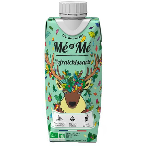 Exquise et parfumée, la boisson Mé-Mé rafraîchissante est composée de thé vert matcha, d'un bouquet de feuilles de menthe et d'une pointe de moût de raisin; sans additifs ni conservateurs et conditionnée dans une brique 100% recyclable avec bouchon en canne à sucre