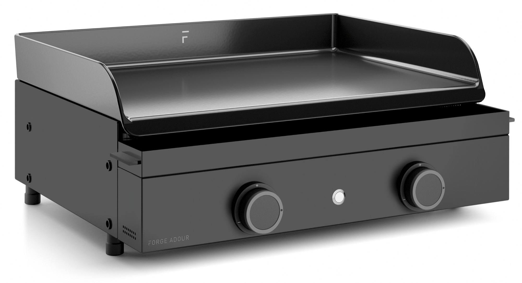 Forge Adour ORIGING60A Plancha gaz Forge Adour ORIGIN G60 A avec plaque monobloc en fonte émaillée inclinable et châssis acier noir double paroi revêtu 3 couches avec 4 pieds fixes.