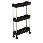Organisez votre rangement grâce à cette desserte à roulettes noire 3 niveaux. Avec elle vos objets du quotidien seront toujours à proximité!Informations sur la desserte à roulettes en plastique 3 niveaux:Dimensions: L.40 x P.13.5 x H.68 cmMatière, plastique4 roulettesà monter