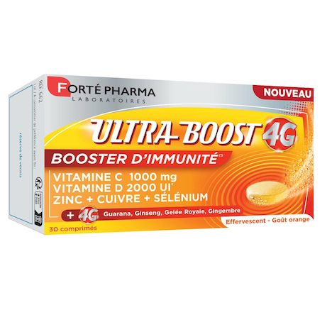 ULTRA BOOST 4G BOOSTER D'IMMUNITÉ associe le complexe 4G Dynamisant : Ginseng, Guarana, Gelée royale et Gingembre à un concentré d’actifs ultra-dosés dédiés au soutien de vos défenses immunitaires.
