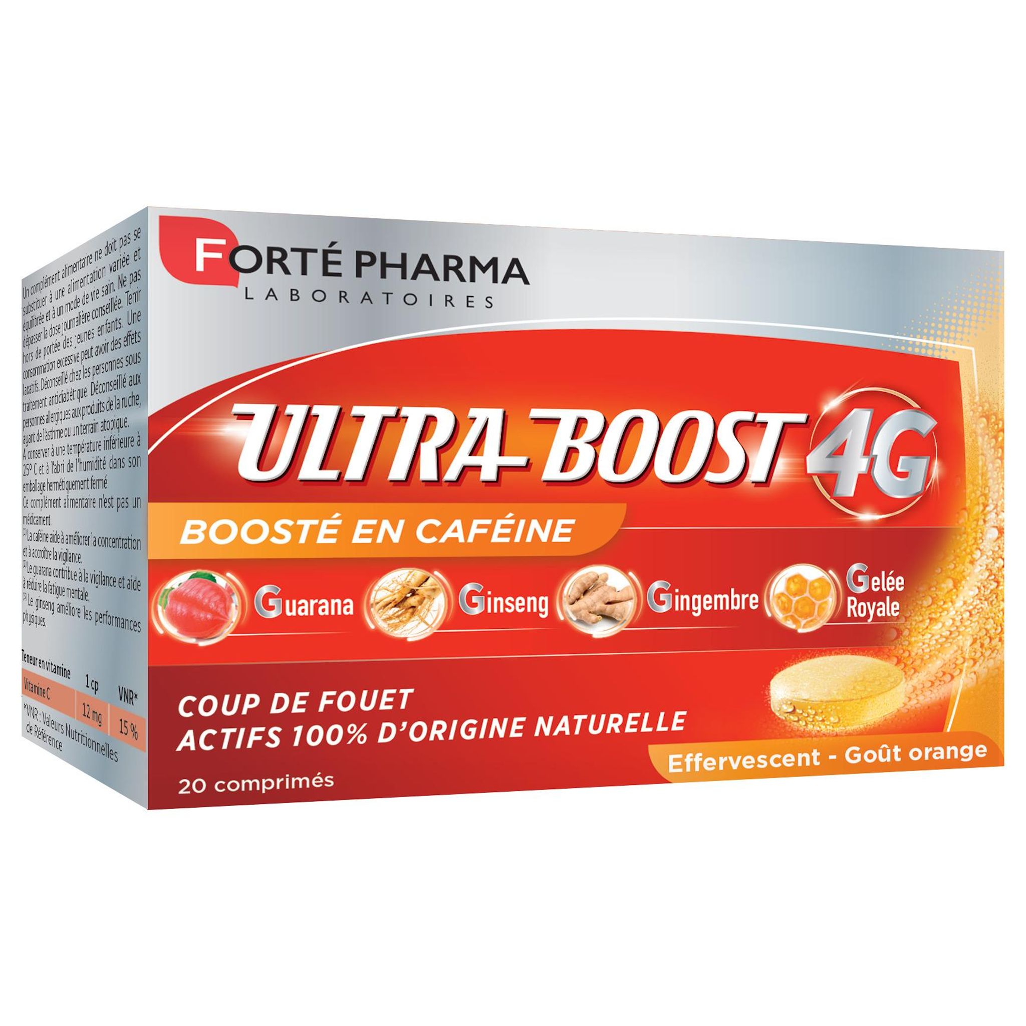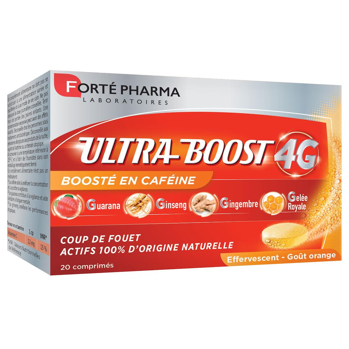 Donner 100% de soi-même toute la journée malgré la pression et l’enchaînement d’activités ? C’est possible ! Les Laboratoires Forté Pharma innovent avec VITALITÉ 4G ULTRA BOOST, un booster aux actifs d’origine 100% naturelle. Sa formule associe le complexe d’actifs naturels 4G, à la caféine, dans un format effervescent pour un effet boost immédiat :