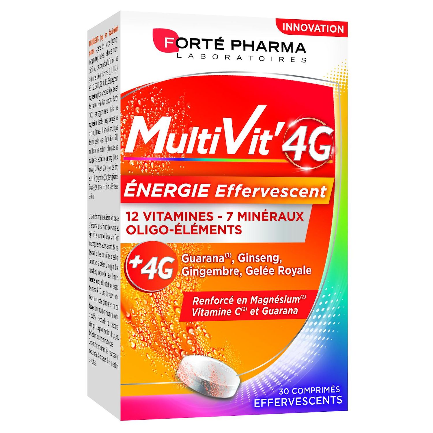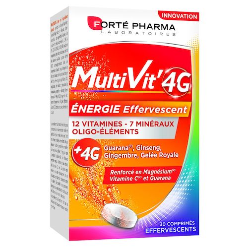 MultiVit’4G ÉNERGIE Effervescent a été spécialement développé par le département Recherche et Développement des Laboratoires Forté Pharma, pour couvrir vos besoins quotidiens en vitamines, minéraux et oligo-éléments. Sa formule très complète associe :