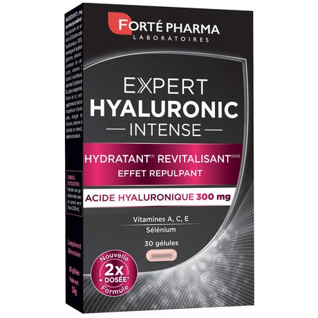 La recherche des Laboratoires Forté Pharma a mis au point Expert Hyaluronic Intense, un complément alimentaire à l’action anti-âge qui aide à hydrater, revitaliser(1) et repulper la peau. Sa formule est hautement dosée en acide hyaluronique, et favorise l’hydratation de la peau. Expert Hyaluronic Intense repulpe la peau de l’intérieur, améliore son élasticité et révèle tout son éclat. Expert Hyaluronic Intense aide à protéger du vieillissement cutané prématuré(2) grâce au complexe anti-oxydant composé des vitamines C, E et du Sélénium.