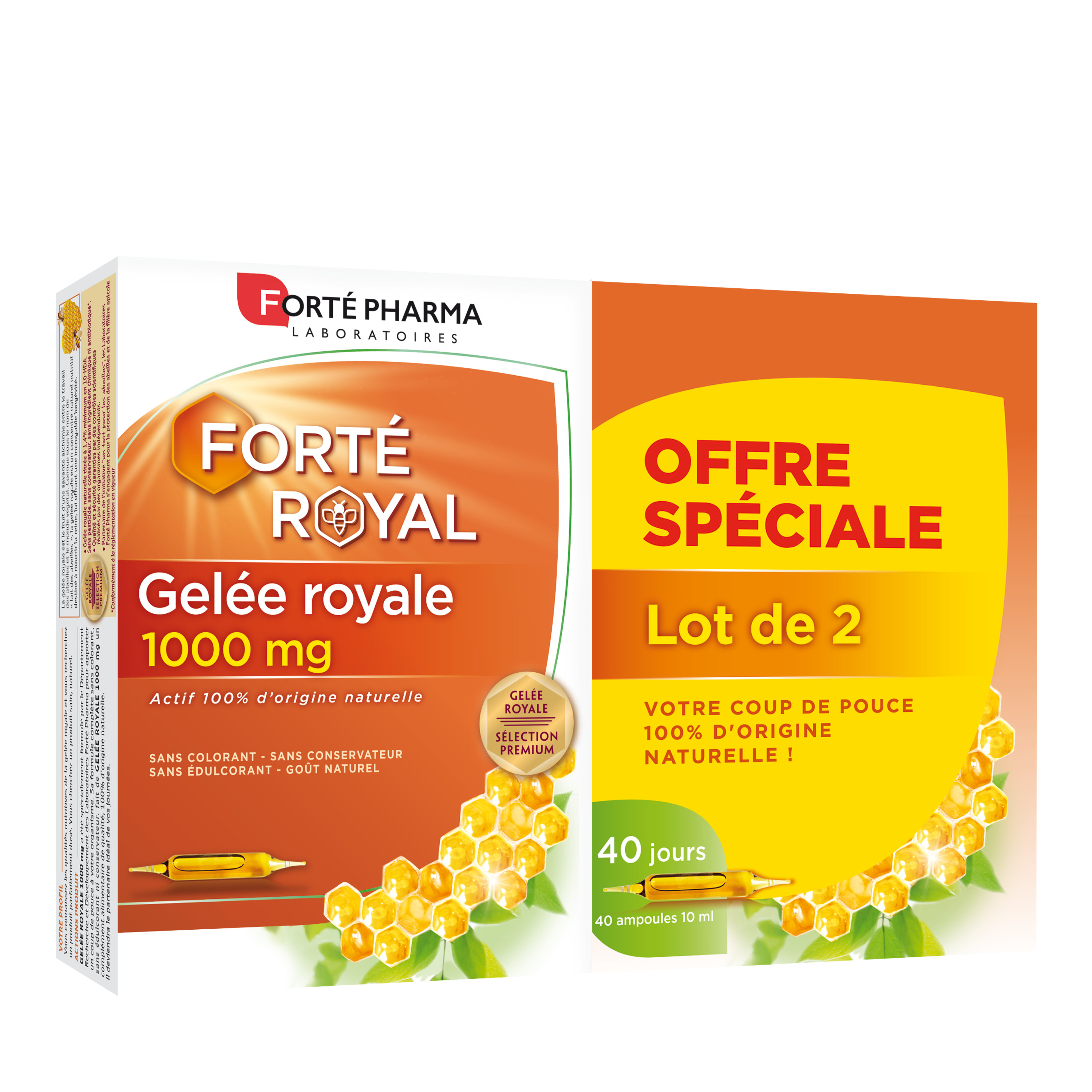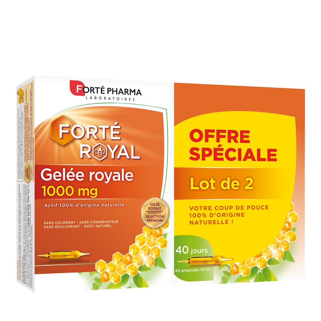 Gelée Royale 1000 mg a été spécialement formulé par le Département Recherche et Développement des Laboratoires Forté Pharma pour apporter un coup de pouce à votre organisme. Sa formule complète sans colorant, sans édulcorant ni conservateur, fait de Gelée Royale 1000 mg un complément alimentaire de qualité, 100% d’origine naturelle. Il deviendra le partenaire bien-être idéal de vos journées. La gelée royale est le fruit d’une savante alchimie entre le travail des abeilles et le monde végétal. Fabriquée par les abeilles à partir de pollen, c’est un concentré naturel nutritif et énergétique. Connue sous le nom de « lait des abeilles », la gelée royale est destinée à nourrir la reine, lui offrant une incroyable longévité.