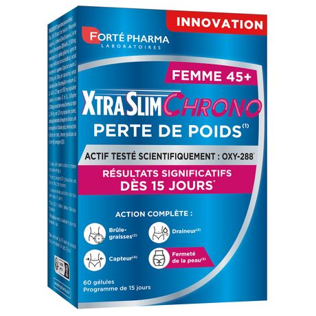 [Cet avis a été recueilli en réponse à une offre.] Cure de compléments alimentaires de la gamme fortepharma xtraslim chrono spécifique pour la femme de plus de 45 ans. Elle se presente sous forme de gélules à prendre avant les principaux repas soit 4 gélules par jour pour 15 jours de cure. Elle m'a permis de booster un rééquilibrage alimentaire en démarrant en force pour booster ma perte et éliminer l 'eau de rétention Elle permet d 'amorcer une perte à condition de maintenir une alimentation équilibré et de s'hydrater suffisamment. Bien sur un avis médical est nécessaire en cas de problèmes de sante particulier ainsi que pour les femmes enceintes et allaitantes. Elle s'adresse à l 'adulte . En terme de résultat Elle m 'a permis d'amorcer une perte de 2kg.
