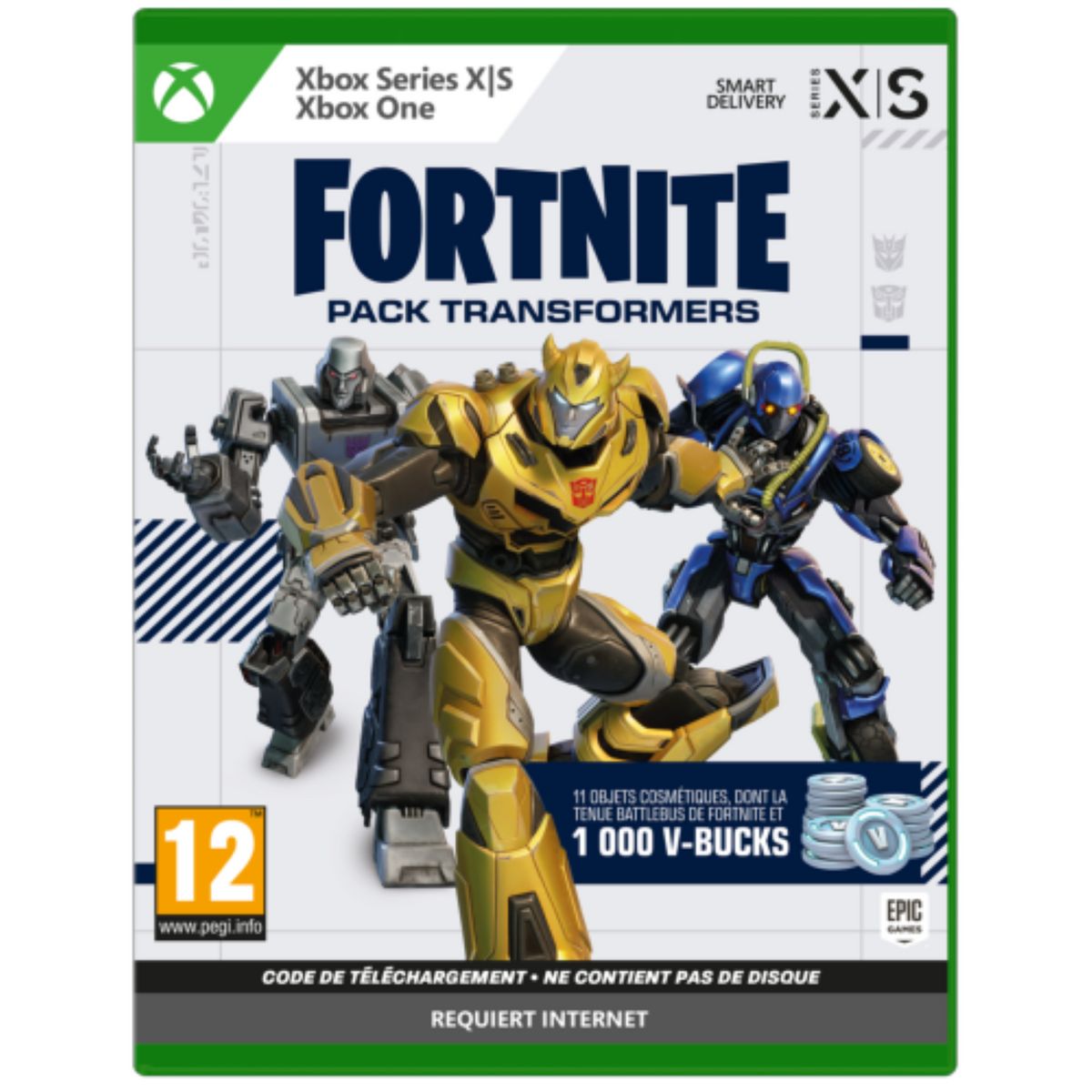 Répondez au cri de ralliement et déployez-vous grâce au pack Transformers. Comprend 3 tenues, 3 accessoires, 3 pioches, 2 emotes et 1 000 V-Bucks !Code de Téléchargement Uniquement. Ne contient pas de cartouche de jeu !